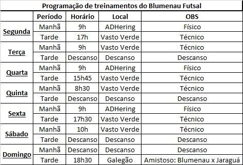 A comissão técnica do Blumenau Futsal divulgou a programação de treinamentos da equipe até o dia 4 de março. A equipe terá na próxima semana, como destaque, a partida amistosa contra Jaraguá. O duelo ocorre no domingo, dia 4, às 18h30, no Galegão, em Blumenau.